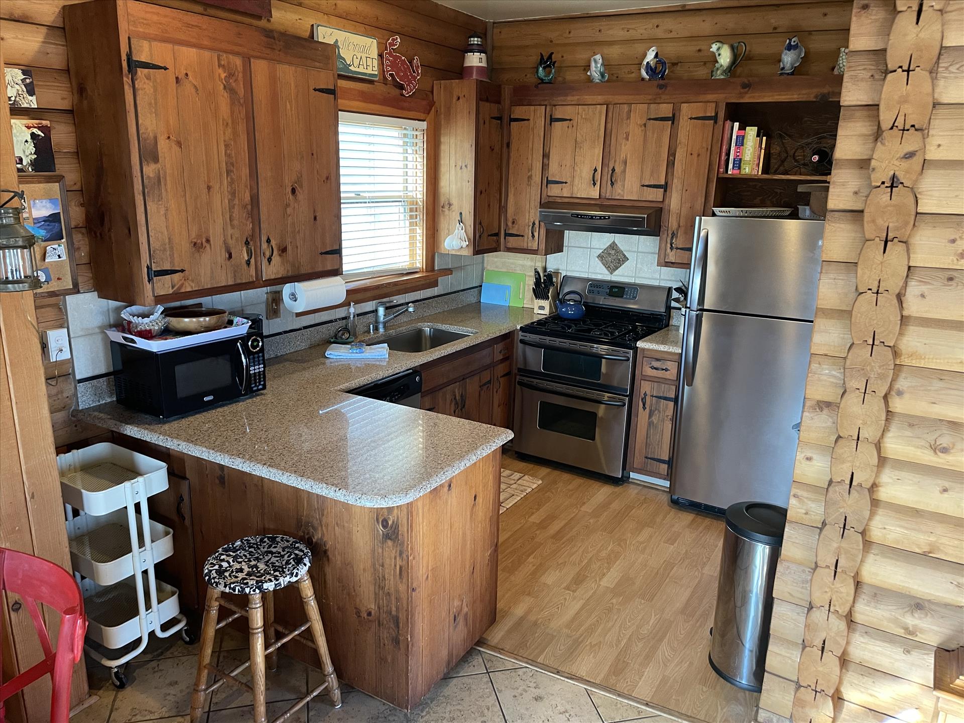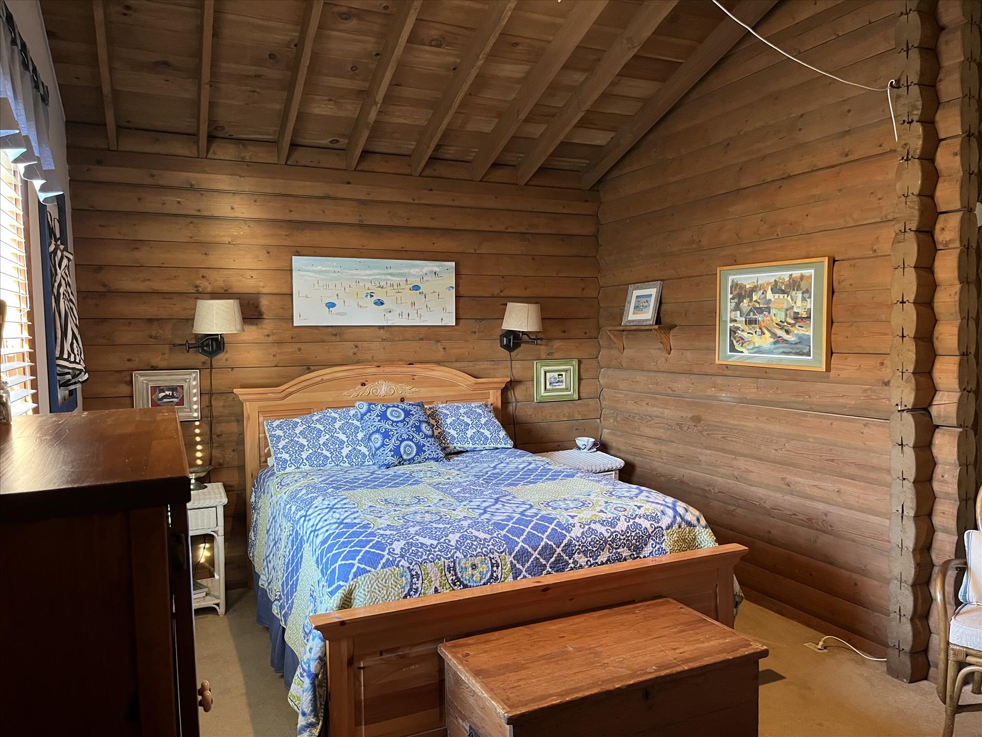 There are 3 bedrooms, two with queen beds and one with bunk beds. There is a loft with a twin bed and a pullout sofa bed in the living room. There are 2 full bathrooms. The living/dining area has a gas fireplace and two sliding French doors leading to a full-length deck. There is a 51” flat screen TV with a dvd player and wifi is also available. The kitchen is fully equipped. You also have use of a washer and dryer.
